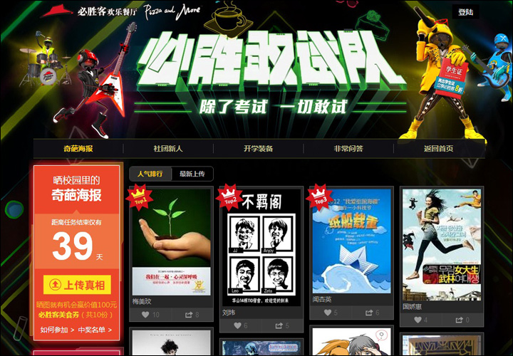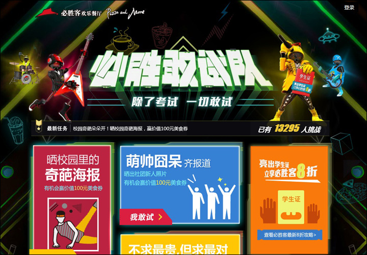 必勝客敢試隊(duì)——除了考試,一切敢試!曬校園里的奇葩海報(bào),曬社團(tuán)新人照片(萌帥呆囧),曬開學(xué)裝備,曬個(gè)人學(xué)生證,在這里沒(méi)有你想不到的,只有你不敢試的。參加活動(dòng),便有機(jī)會(huì)獲得必勝客美食券,鼓起勇氣,召喚小伙伴一起來(lái)試吧!