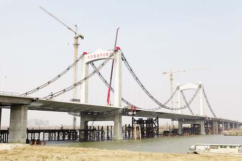 昨天上午,記者登上大慶路淮河公路橋主橋面時,熱鬧的施工現(xiàn)場與寒冷的天氣形成了鮮明的對比。大橋最南端的接線上,幾臺機器正在攤鋪最后一層瀝青。大慶路淮河公路橋建設指揮部技術質(zhì)量部部長薛峰告訴記者,橋面瀝青一天之內(nèi)就能鋪好。“瀝青是最后一道主要工序,完成后就標志大橋主體大功告成了。”